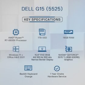Dell G15-5525 Gaming Laptop, AMD R7-6800H, 16GB DDR5, 1TB SSD, NVIDIA RTX 3070 Ti (8GB GDDR6), 15.6″ (39.62Cms) FHD Wva Ag, 165 HZ 300 Nits, Win 11+ Mso’21, Phantom Grey (D560898Win9S, 2.51Kgs)