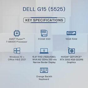 Dell Gaming G15 5525, AMD R7-6800H, 16GB, 512GB SSD, NVIDIA RTX 3050 (4GB GDDR6), 15.6″ (39.62Cms) FHD WVA AG 120Hz 250 nits, Win 11 + MSO’21, McAfee 15 Months, Phantom Grey with speckles, 2.51Kgs