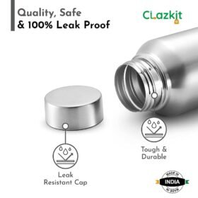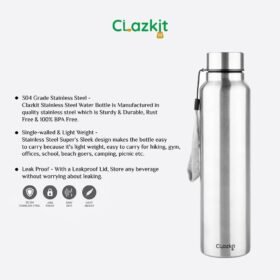 Clazkit Stainless Steel Water Bottle, 1000 ml – Single-Walled, Spill-Proof, Food Grade Steel | Fridge, Office, School, Travel, Gym, Car (Silver)