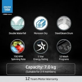 Voltas Beko, Top Load 7 Kg 5 Star Eco Wash/Monsoon Dry Fully-Automatic Washing Machine (WTL70, Water Reuse, Side Waterfall, Mansoon Dry, Dark Grey)