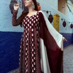 Women Printed Viscose Rayon Anarkali Kurta With Attached Dupatta (Maroon, White)