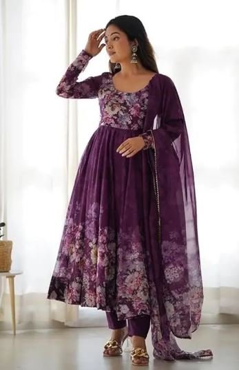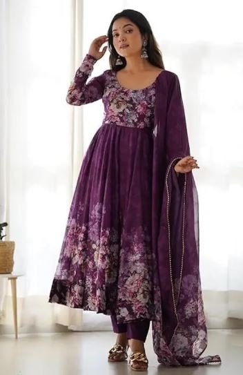 Embrace the timeless elegance of traditional Indian attire with this stunning purple anarkali dress. Meticulously crafted with intricate floral patterns adorning the soft, lightweight fabric, this dress exudes an air of sophistication and grace. The sweeping floor-length silhouette, accentuated by the flared skirt, creates a flattering and feminine silhouette. The long, sheer sleeves add a touch of modesty while allowing for breathability, making it a perfect choice for warm weather. Whether attending a festive occasion or seeking a refined look for a special event, this anarkali dress is sure to turn heads and leave a lasting impression. Pair it with complementary jewellery and accessories to complete your regal ensemble. Please refer to the size chart for accurate measurements before purchasing.